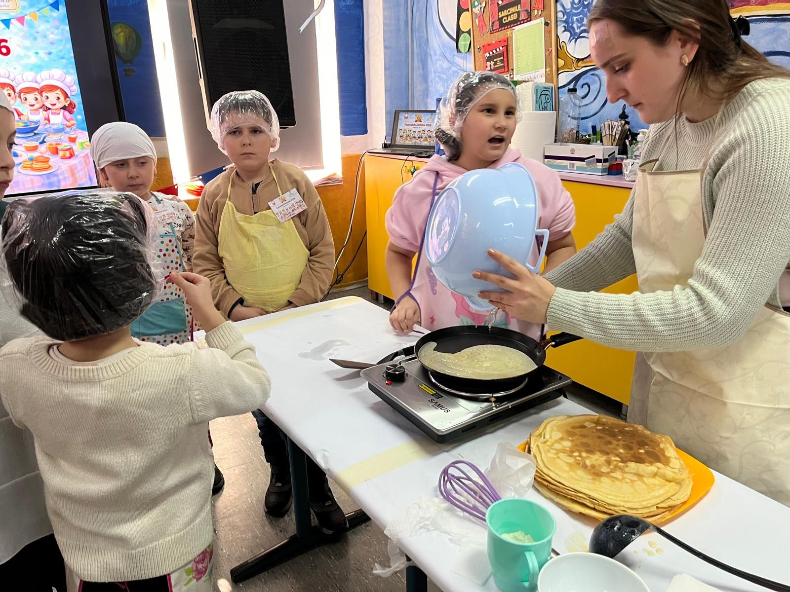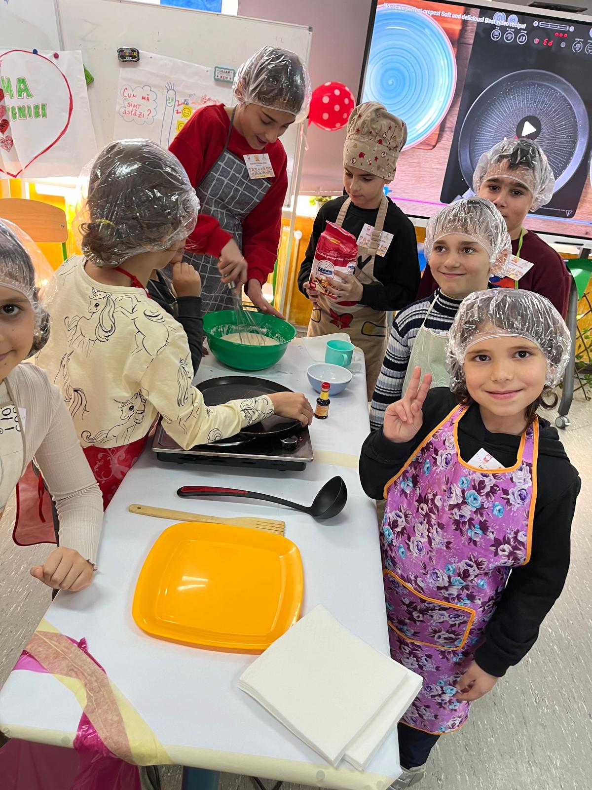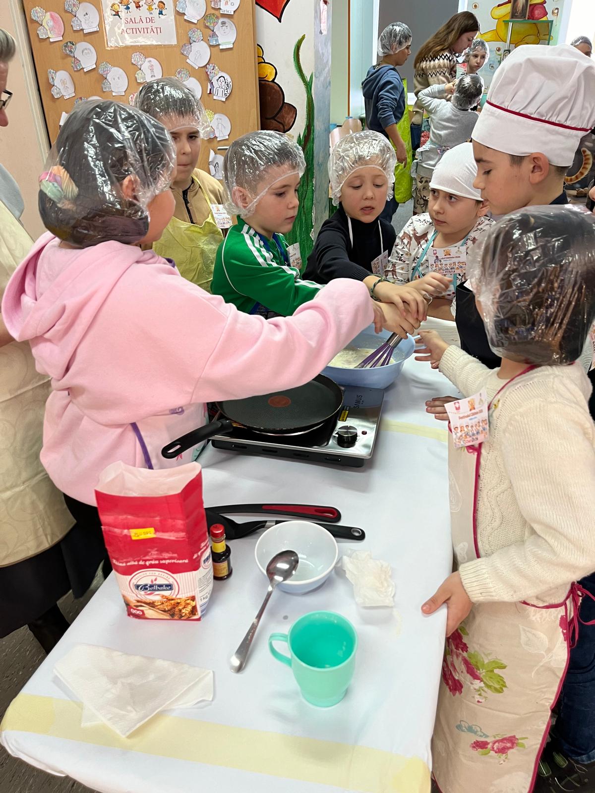 Participanţii au fost implicaţi în fiecare etapă: pregătirea ingredientelor, amestecarea compoziţiei, coacerea clătitelor cu sprijinul adulţilor şi la final decorarea cu gem, ciocolată, fructe, frişcă şi bomboane decorative. Fiecare echipă a avut ocazia să îşi pună amprenta cretivă asupra preparatelor , transformând simplele clătite în adevărate opere culinare.